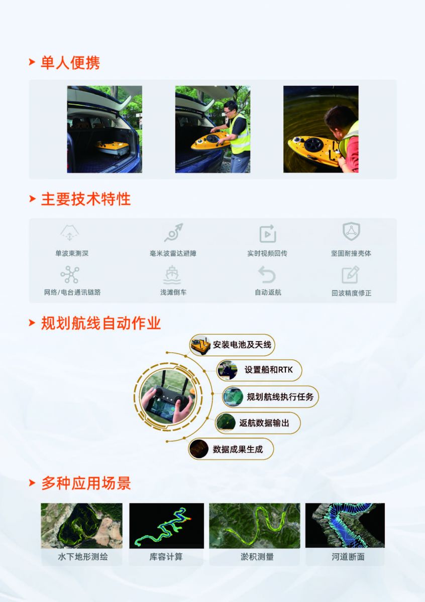 便携式无人测量船 专为江河湖库和近海测量设计,搭配双泵喷推进器动力澎湃,抵抗急水流;多重抗缠绕设计,可以实现水下高精度测量工作。可测量水深、水下地形、水下土方测量、水下地形建模,完成水下勘测、水下清淤测量、库容计算等工作,轻巧便携,单人即可测量作业。
